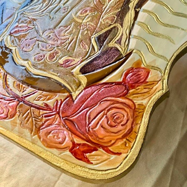 mas detalles en tornasoles y dorados, finalmente laqueada.