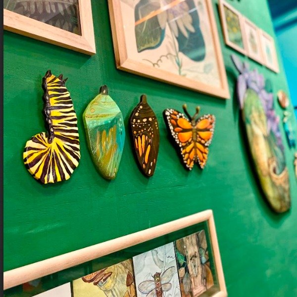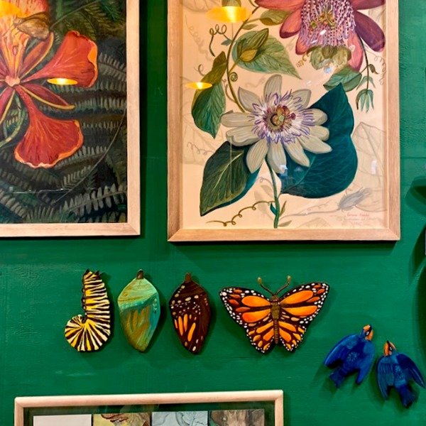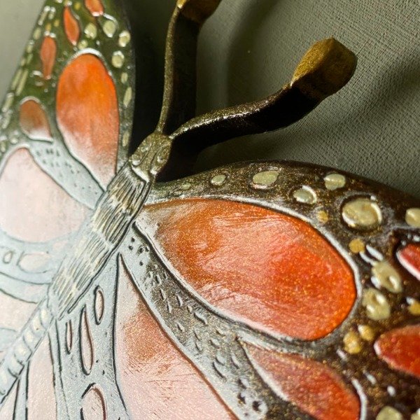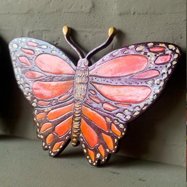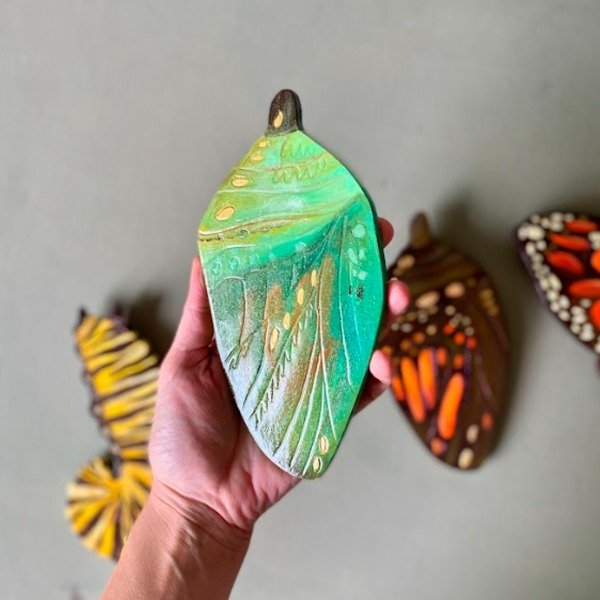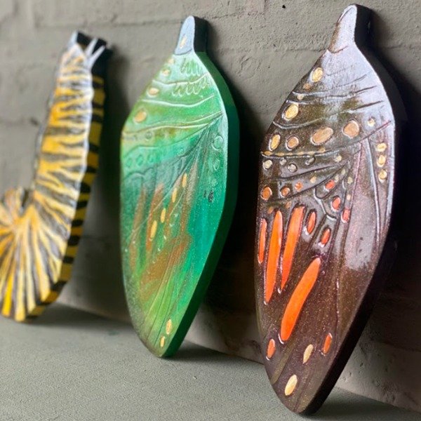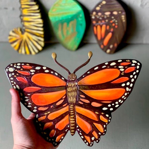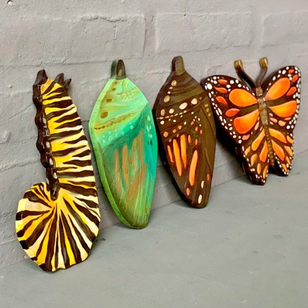 Medidas aproximadas: Mariposa 28 x 20 cm / Crisálidas y Gusano: 20 x 10,5 cm / Todas con espesor: 9 mm
